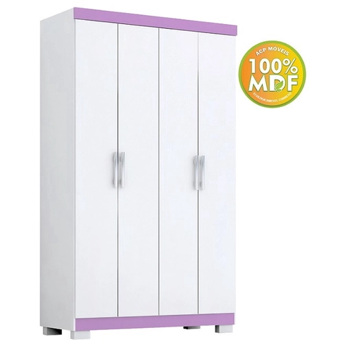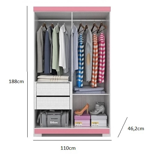 Clássico e versátil, o Roupeiro Juliana permite várias opções de cores, podendo ser montado todo branco ou com detalhes em Rosa, Azul ou Lilás. Possui 2 gavetas com corrediças telescópicas, 2 cabideiros em alumínio, 2 prateleiras, que permitem melhor organização do espaço interno. Pés inclusos na cor do produto. Produzido 100% mdf com pintura interna em Linho.
